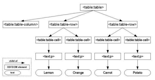 Note: In the OpenDocument standard the ODF elements are reused among all document types. The above XML of a table is for instance equally usable in Text and Spreadsheet documents.