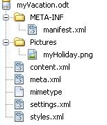 At this layer a document is in general represented by a bundle of named resources zipped to a package. For instance, an ODF text document like 'myVacation.odt' might contain the following files: